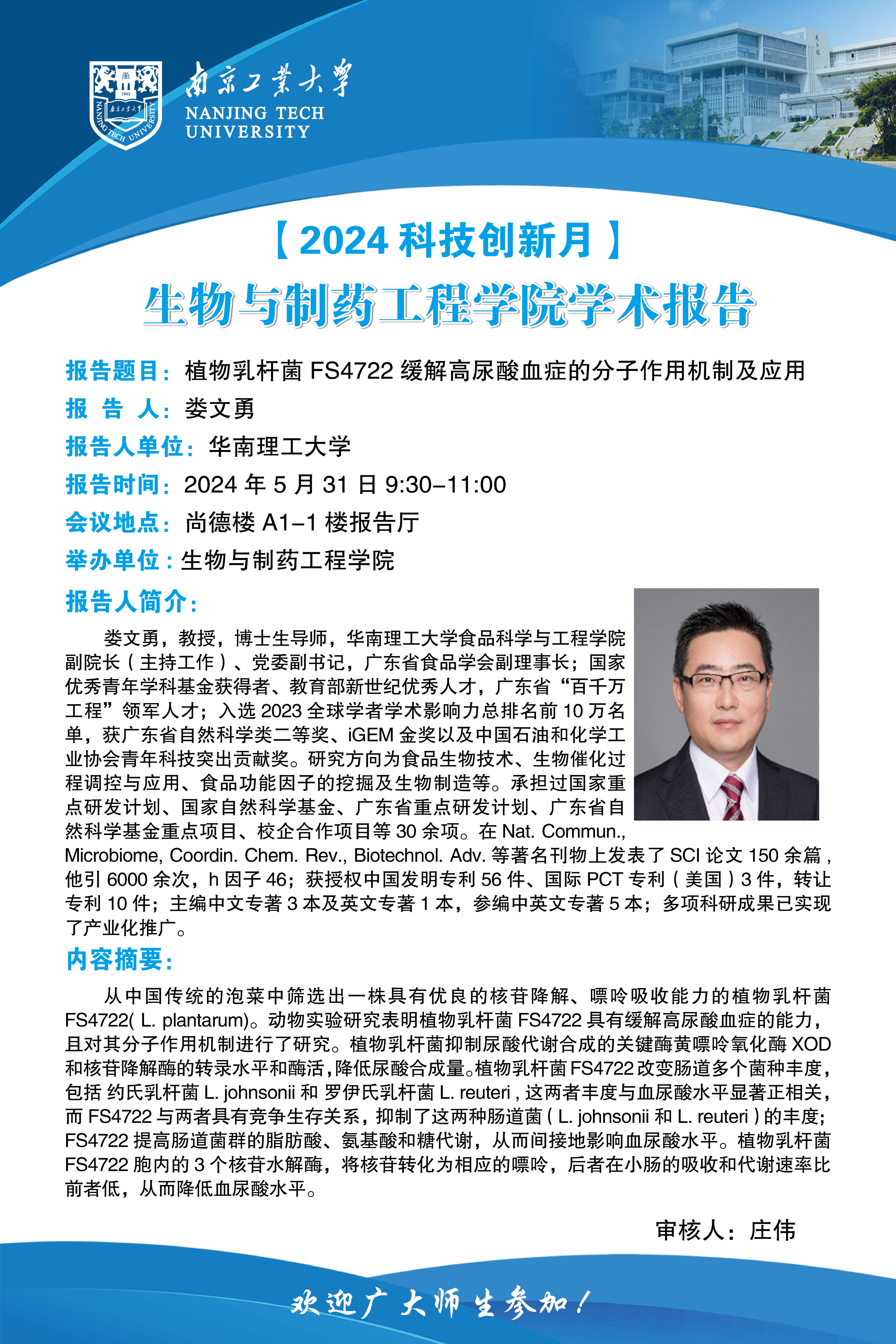 娄文勇:植物乳杆菌FS4722缓解高尿酸血症的分子作用机制及应用
